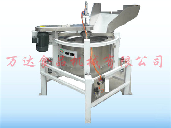 全自動脫油機(jī)的基本工作原理是利用脫油筒高速轉(zhuǎn)動產(chǎn)生的離心力的作用將粘附在花生米表面的附油脫離出去,脫離下來的油通過機(jī)架上的出油管流到機(jī)體外的收集桶中。脫油后的花生米通過氣缸控制脫油籠中閥的提升,從落料口通過滑落到冷卻輸送帶(或料斗)中,然后進(jìn)行下一步工序處理。